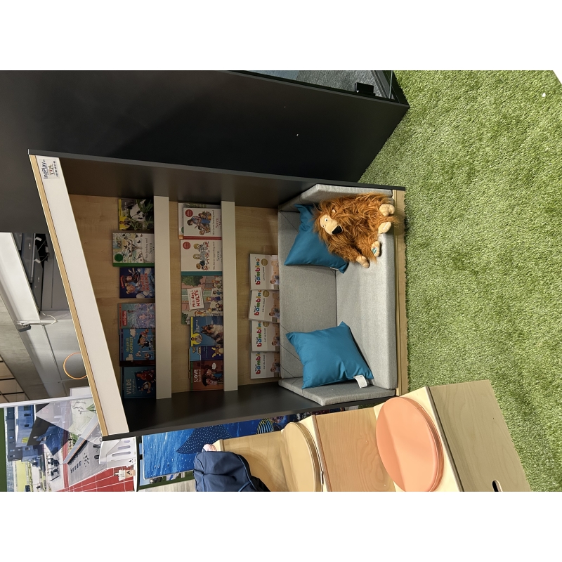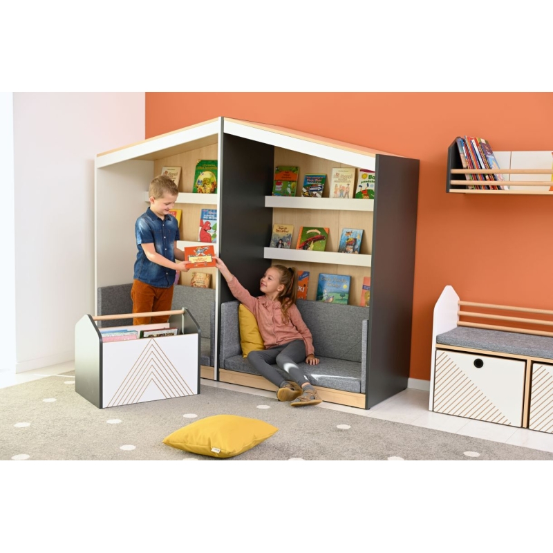 Den perfekte ”hule”, hvor børn kan trække sig tilbage og fordybe sig i bøger og leg. Det stilrene læsehus byder på tre flade boghylder, hvoraf en er placeret bag ryglænet, og en kraftig hynde i skum. Smuds- og vandafvisende tekstilbetræk gør det nemt at holde læsehuset rent og pænt. Læsehuset kan stå alene eller sættes sammen, som vist på billederne